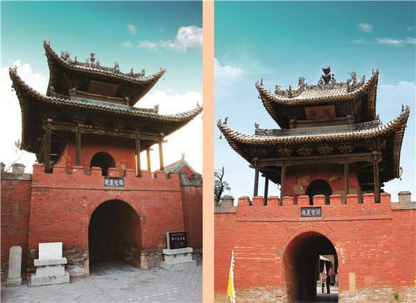 位于关帝祖庙最南端,为主庙正南门。始建年代不祥,重建于明嘉靖年间,是一座古朴恢宏的砖结构宫门。外观砖雕为仿木建筑,门楣正中镌刻“关帝庙”三个大字,门洞背面上方有“扶汉人物”匾额,两次间门洞上层东面横额为“精忠贯日”,西为“大义参天”。端门比例协调,造型典雅,雕饰苍劲,勘称明代砖构门庑中的佳作。