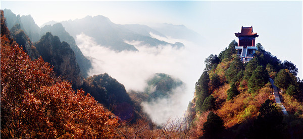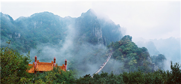 玉柱峰,又名“云峰”、“灵峰”,为五老峰之主峰,海拔1809.3米,壁立千仞,险要神奇,四面如削,拔地通天,似一根直刺苍穹云表的擎天柱石,被称誉为“天下奇峰”。“巍巍中条玉柱峰,直耸云雾放苍穹,仰为观止空怅望,攀越而上显英雄”正是对玉柱峰的生动写照。登玉柱峰途经穿心茶坊、莲花台、明眼洞、观景台和铁索天桥,下山可坐滑道。峰顶面积5亩有余,上有仙桥、南天门、观景台、玉皇殿等。烟雾常锁,山松掩映,俨然一个云端仙境。登上玉柱金顶,吸天地之灵气,汲日月之精华,是对游客勇气、毅力、意志、胆识的一个考验,也让你领略“会当凌绝顶,一览众山小”的壮丽美景。